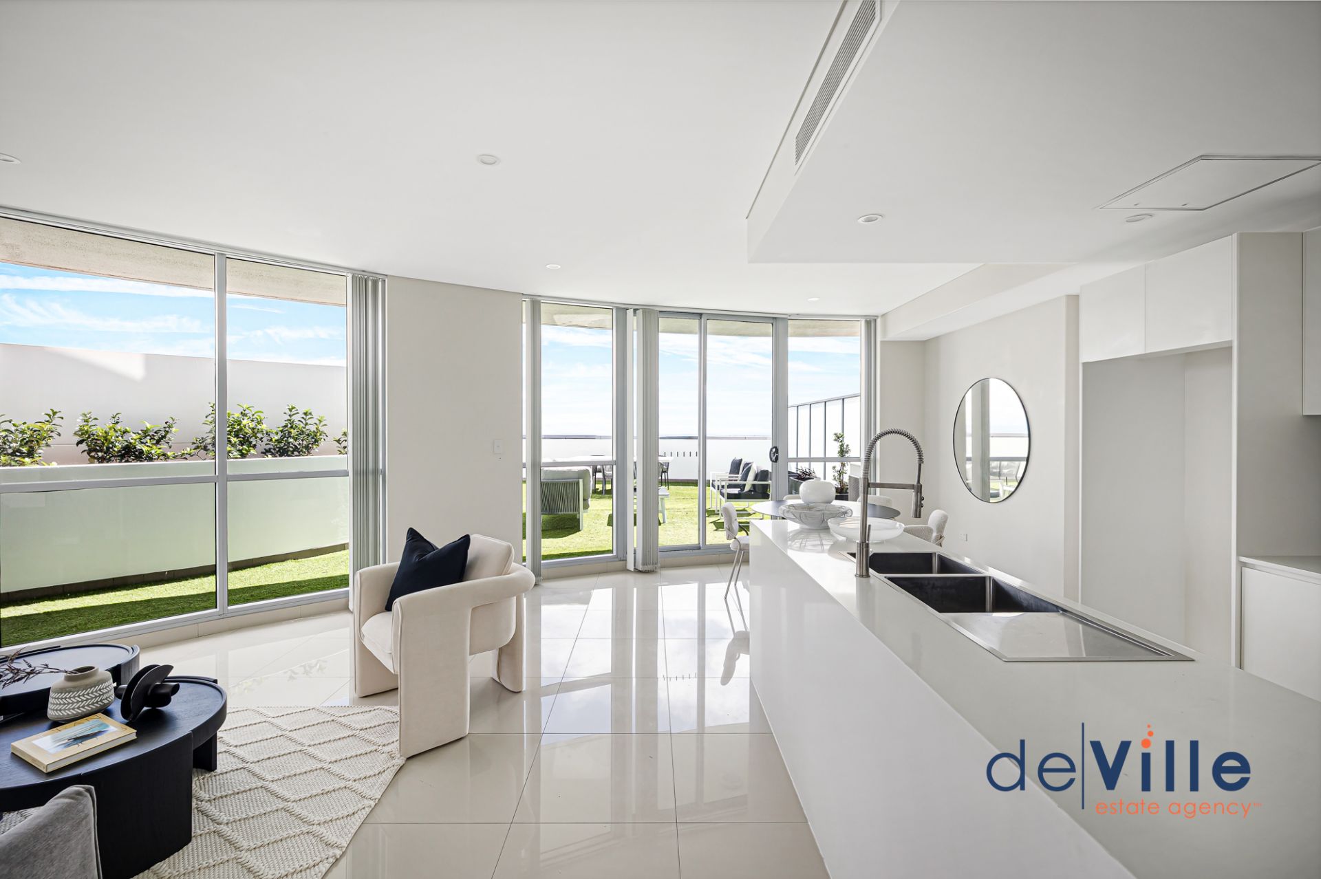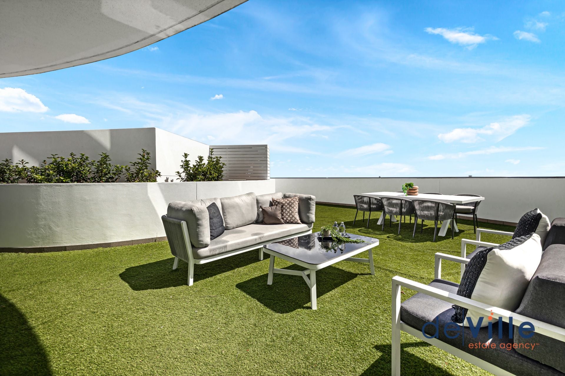 Expansive entertainer's balcony with uninterrupted views and artificial grass for low-maintenance appeal
